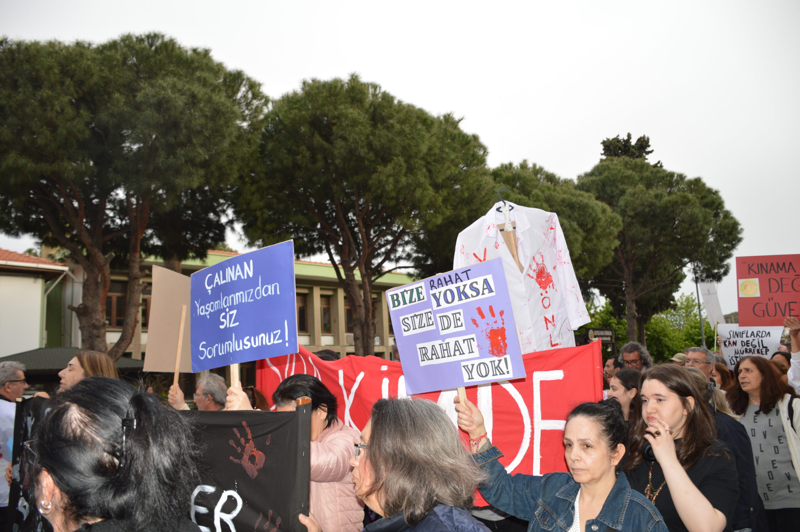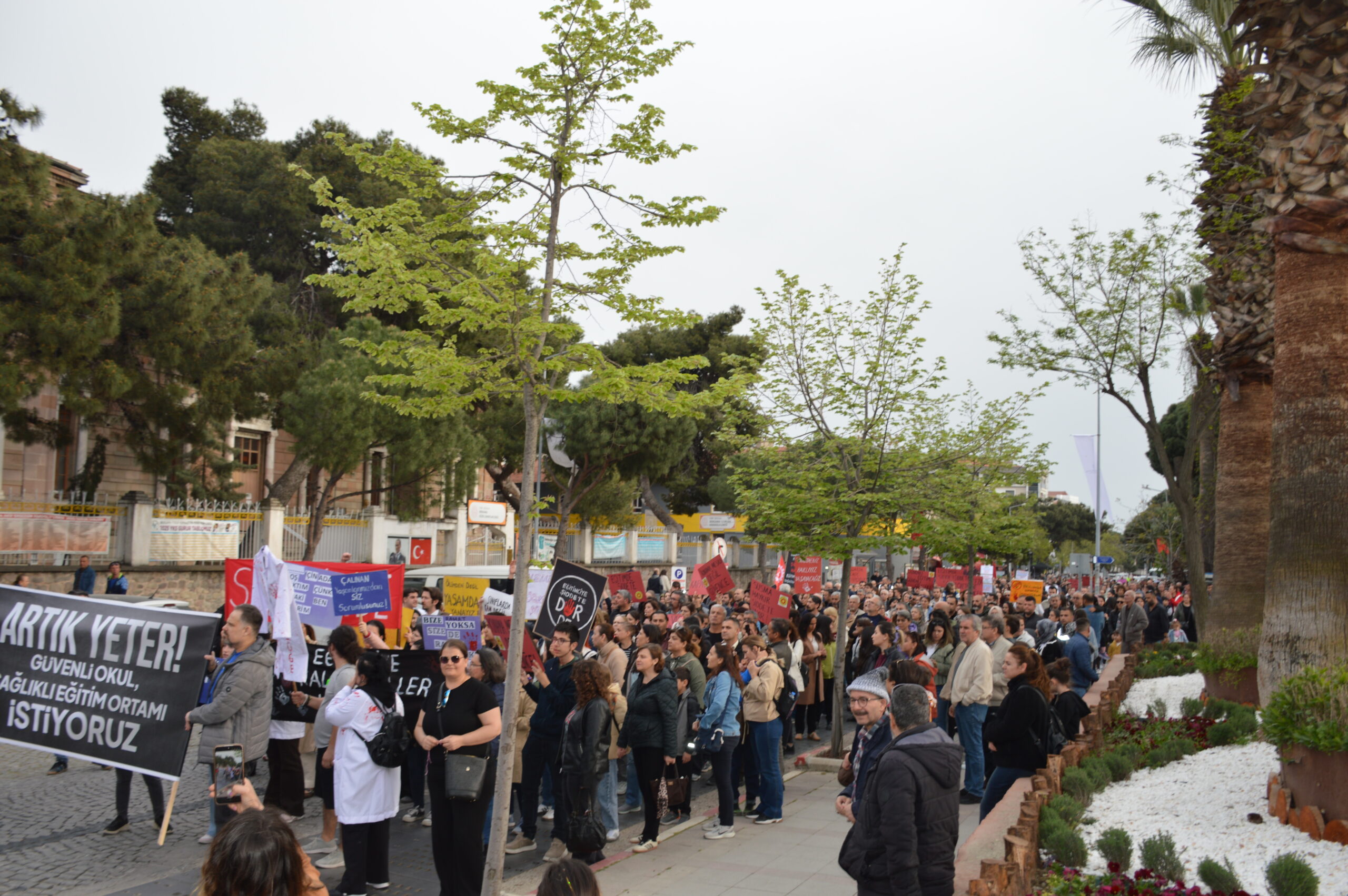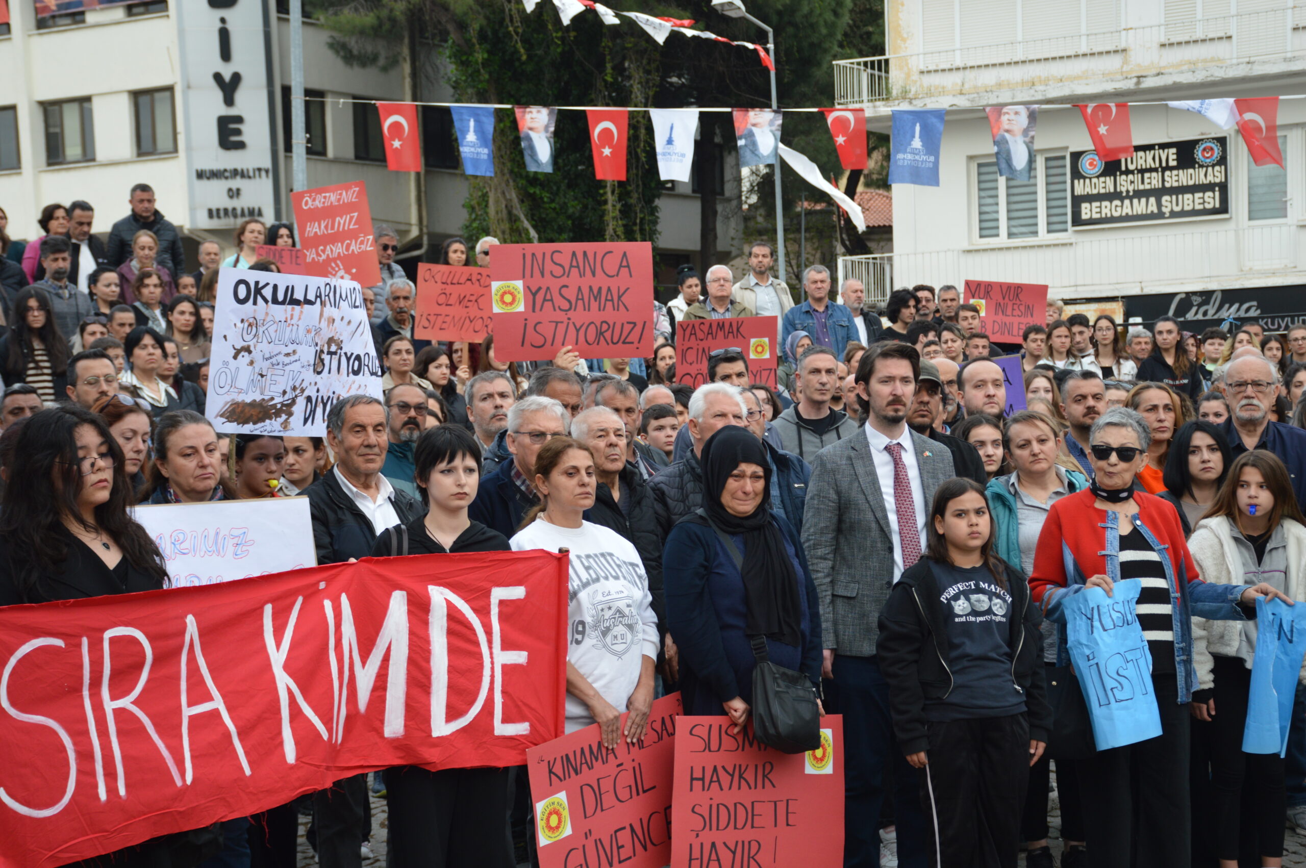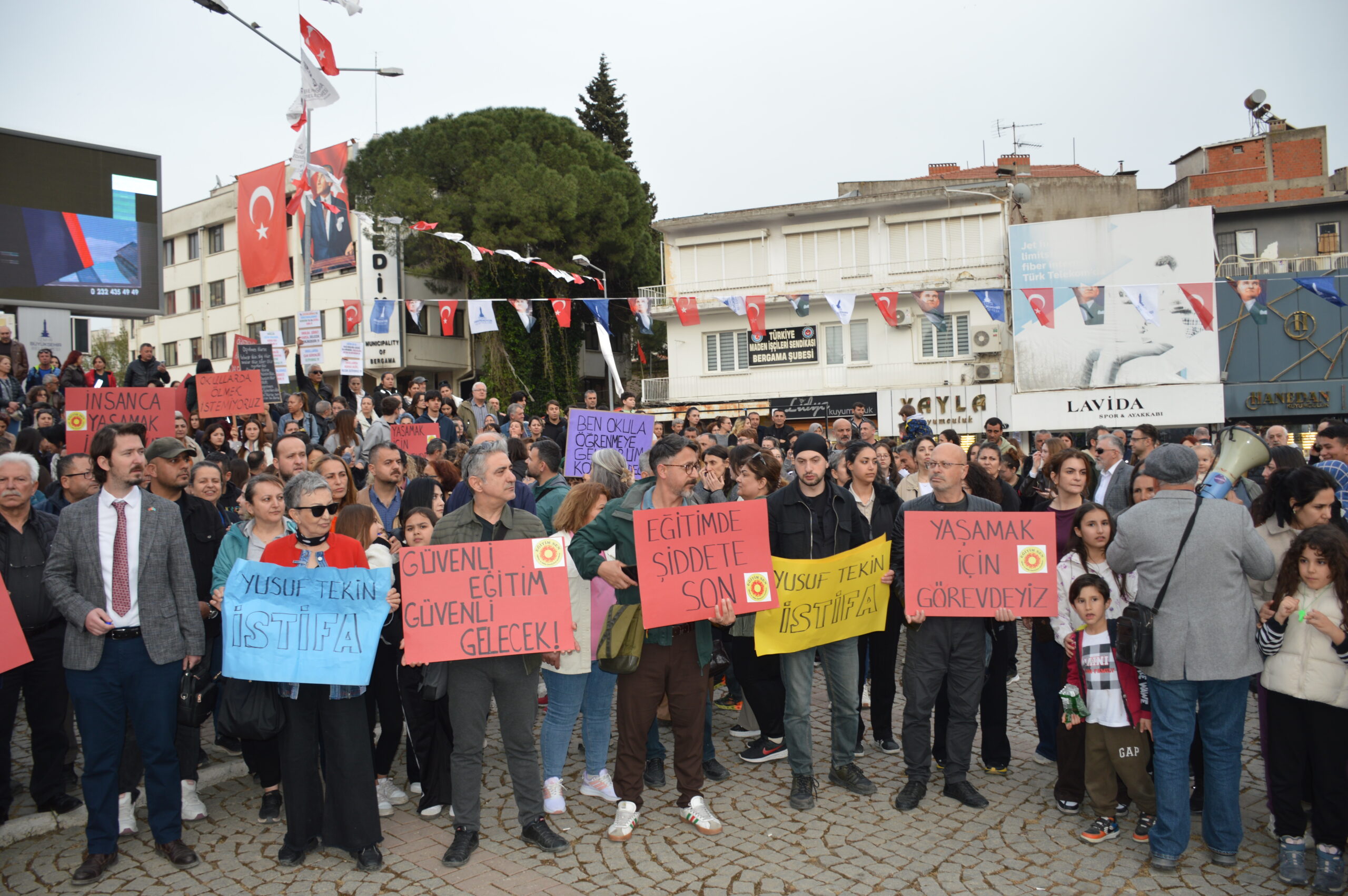 Okullarda art arda yaşanan şiddet olaylarına karşı Eğitim İş ve Eğitim Sen’in çağrısıyla Bergama’da kitlesel bir yürüyüş düzenlendi. Çok sayıda veli, öğrenci ve vatandaşın katıldığı yürüyüş, Bergama Kültür Merkezi önünden başladı. Yürüyüş boyunca, “Okullarda ölmek istemiyoruz”, “Öğretmenler burada Yusuf Tekin nerede?”, “Hükümet istifa, Eğitim Bakanı Yusuf Tekin istifa” ve “Güvenli gelecek, güvenli okullar” sloganları yükseldi.