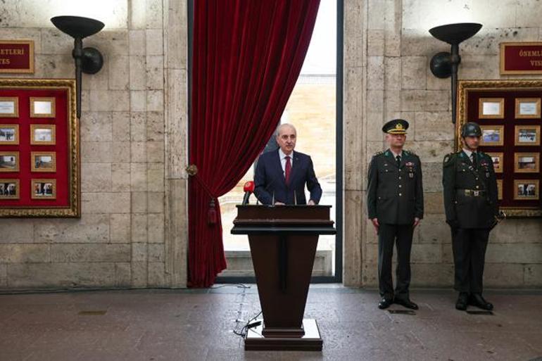 Aslanlı Yol'dan yürüyerek Gazi Mustafa Kemal Atatürk'ün mozolesine gelen heyet, TBMM Başkanı Kurtulmuş'un mozoleye çelenk bırakmasının ardından saygı duruşunda bulundu ve İstiklal Marşı'nı okudu.