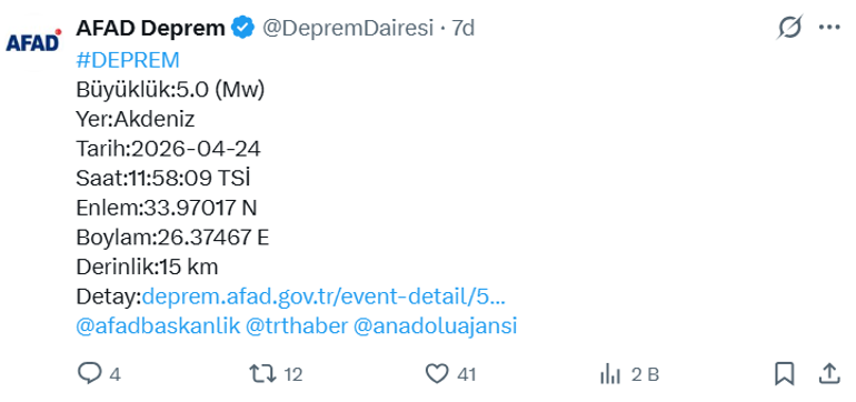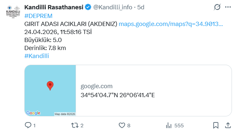 Kandilli Rasathanesi, Akdeniz açıklarında meydana gelen depremin 24 Nisan 2026 saat 11.58’de Girit Adası açıklarında kaydedildiğini açıkladı. Depremin büyüklüğünün 5.0, derinliğinin ise yaklaşık 7.8 kilometre olduğu bildirildi.