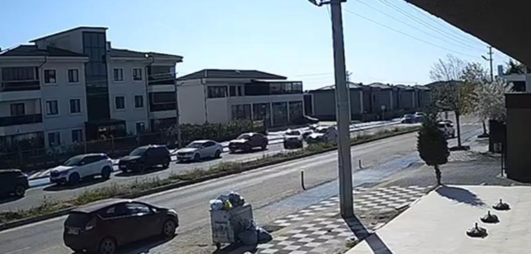 Tekirdağ'ın Çorlu ilçesinde otomobil, yol kenarında park halindeyken sürücüsünün hareket ettirdiği başka bir otomobile çarpıp, taklalar attı. Bir iş yerinin güvenlik kamerasına yansıyan kazada 2’si çocuk, 5 kişi yaralandı.